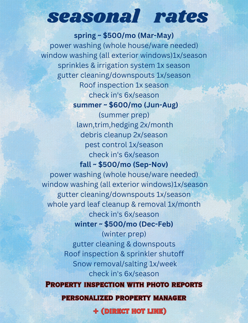 Welcome to Blue Lakes Property Management, where we offer year-round property management services based in Michigan. Discover how our subscription based monthly plans ensure your property is cared for with photo reports and personal assigned agent. Join us as we protect and enhance your investment, providing exceptional service every step of the way.
